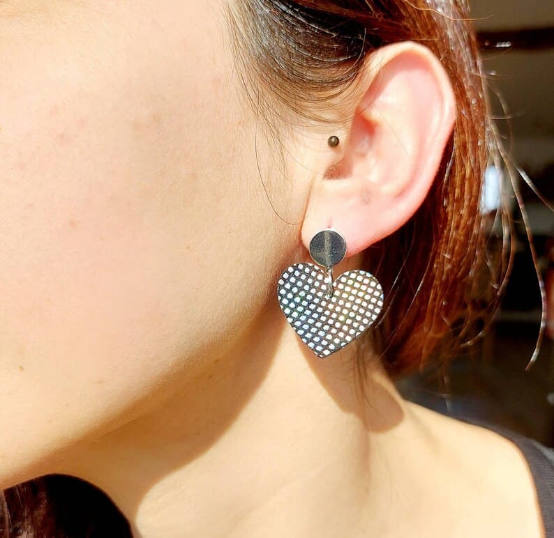 Des boucles d’oreilles qui envoient du love avec ces cœurs en cuir au motif glamour, façon « disco »! Succès garanti. Hypoallergénique, fabrication artisanale française. Cadeau idéal.