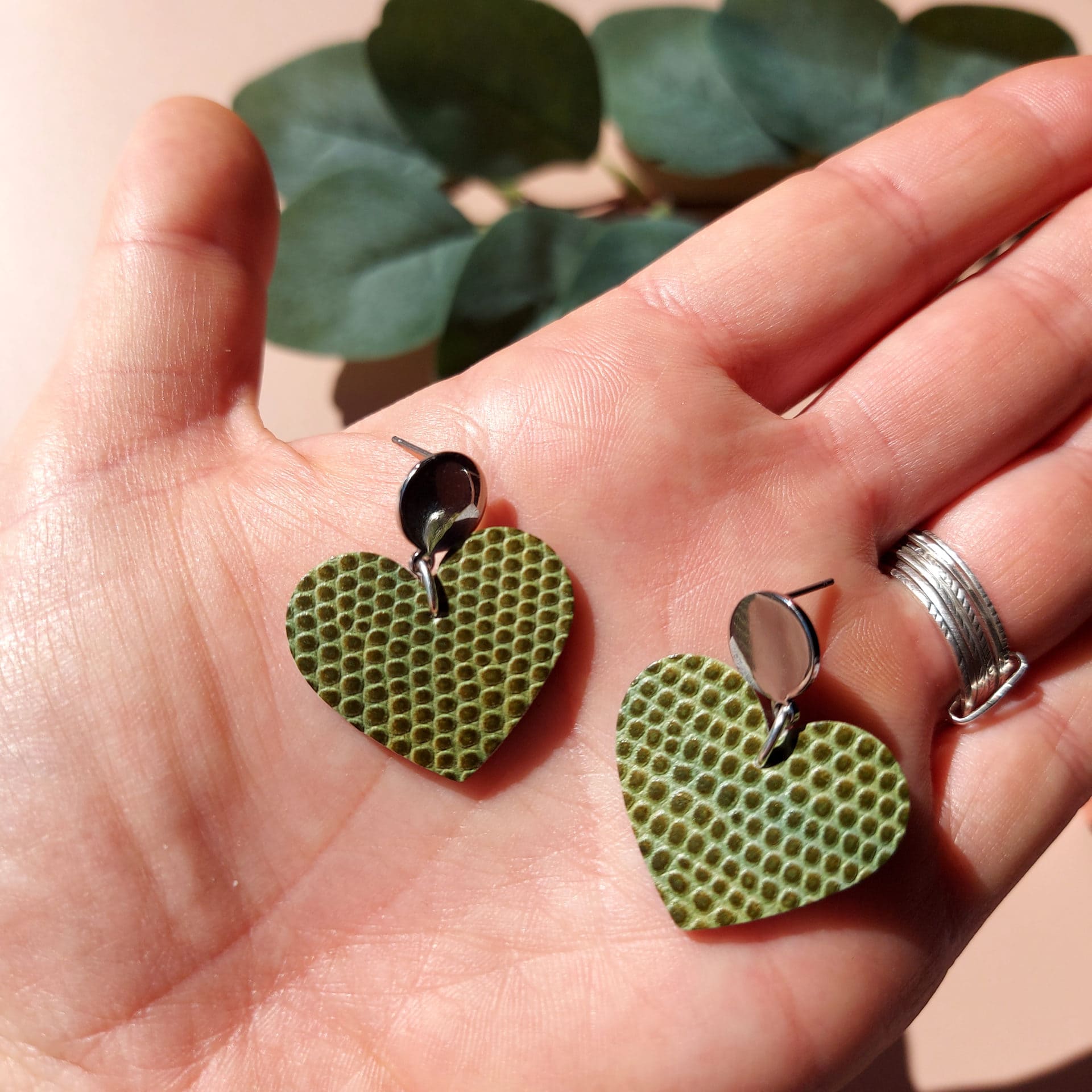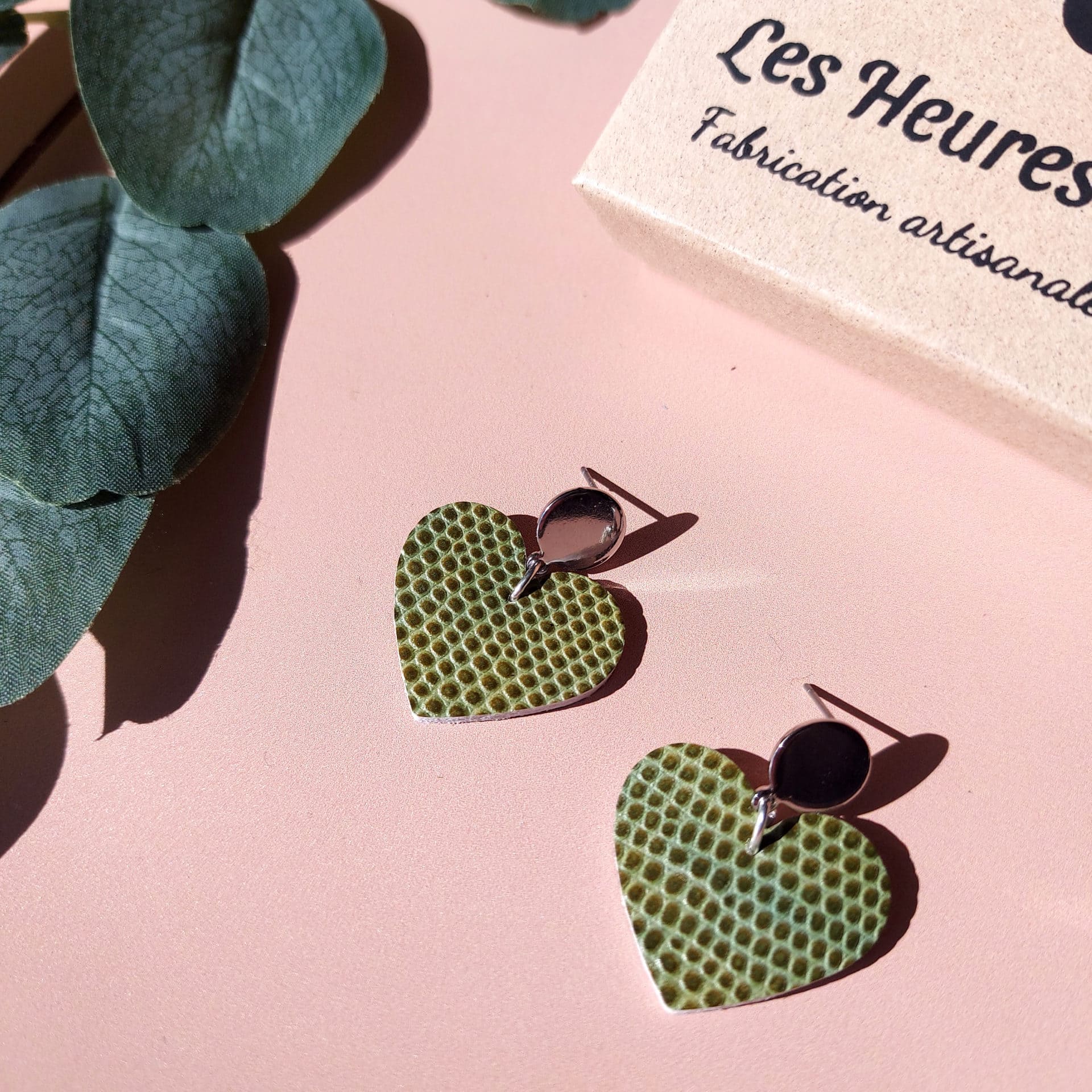 Boucles d’oreilles cœur cuir vert clair