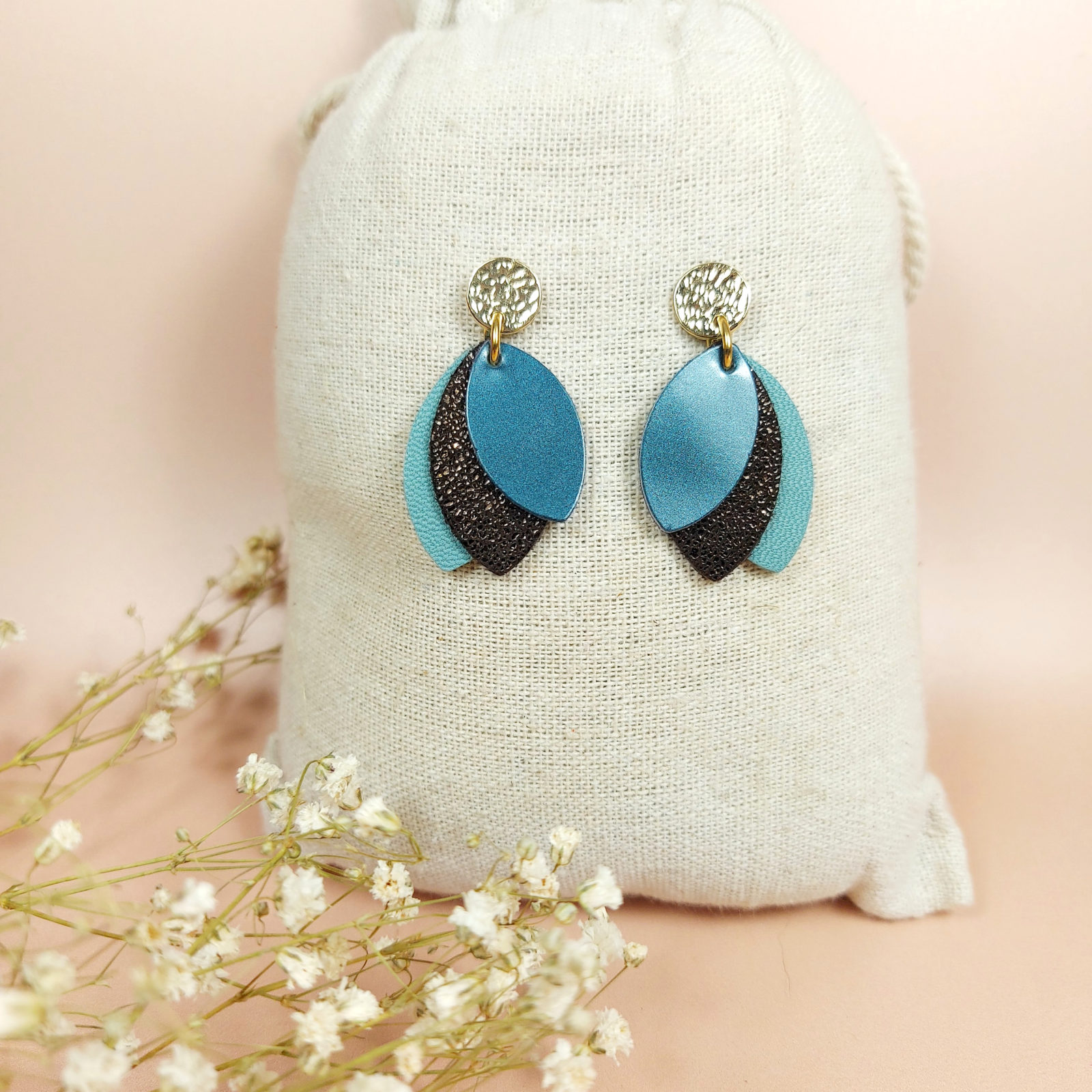 Voici les nouvelles boucles d'oreilles "Demoiselles" en cuir décliné dans un magnifique camaïeu de bleu. En portant cette paire à vos oreilles, vous vous octroyez une parenthèse agréable et poétique. Vous empruntez le chemin vers la féminité, la délicatesse et même le romantisme.