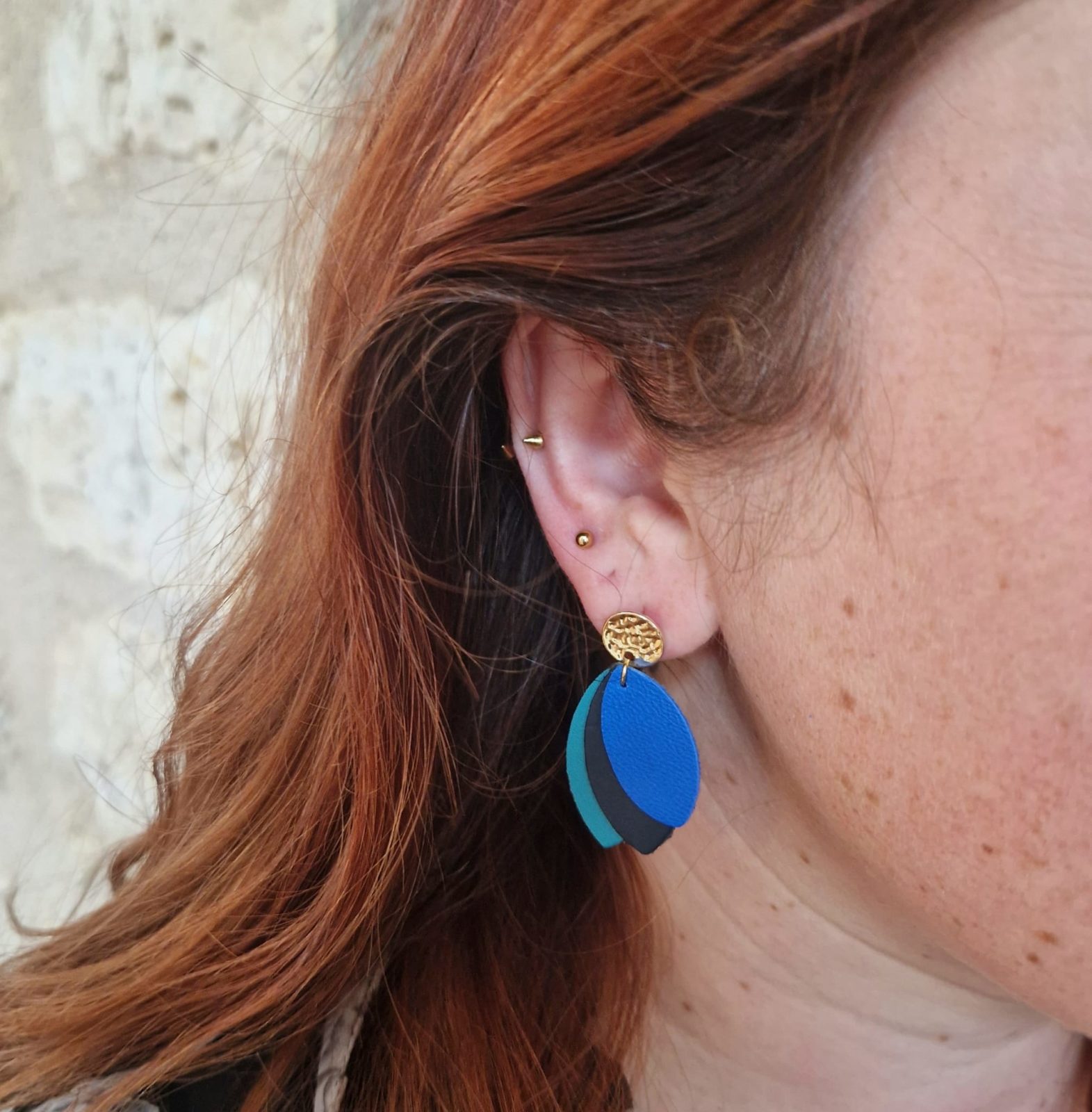 Vous cherchez un bijou harmonieux et délicat? Ces boucles d’oreilles déclinées dans 3 cuirs bleu sont de vrais trésors pour donner une touche d’élégance à votre tenue.