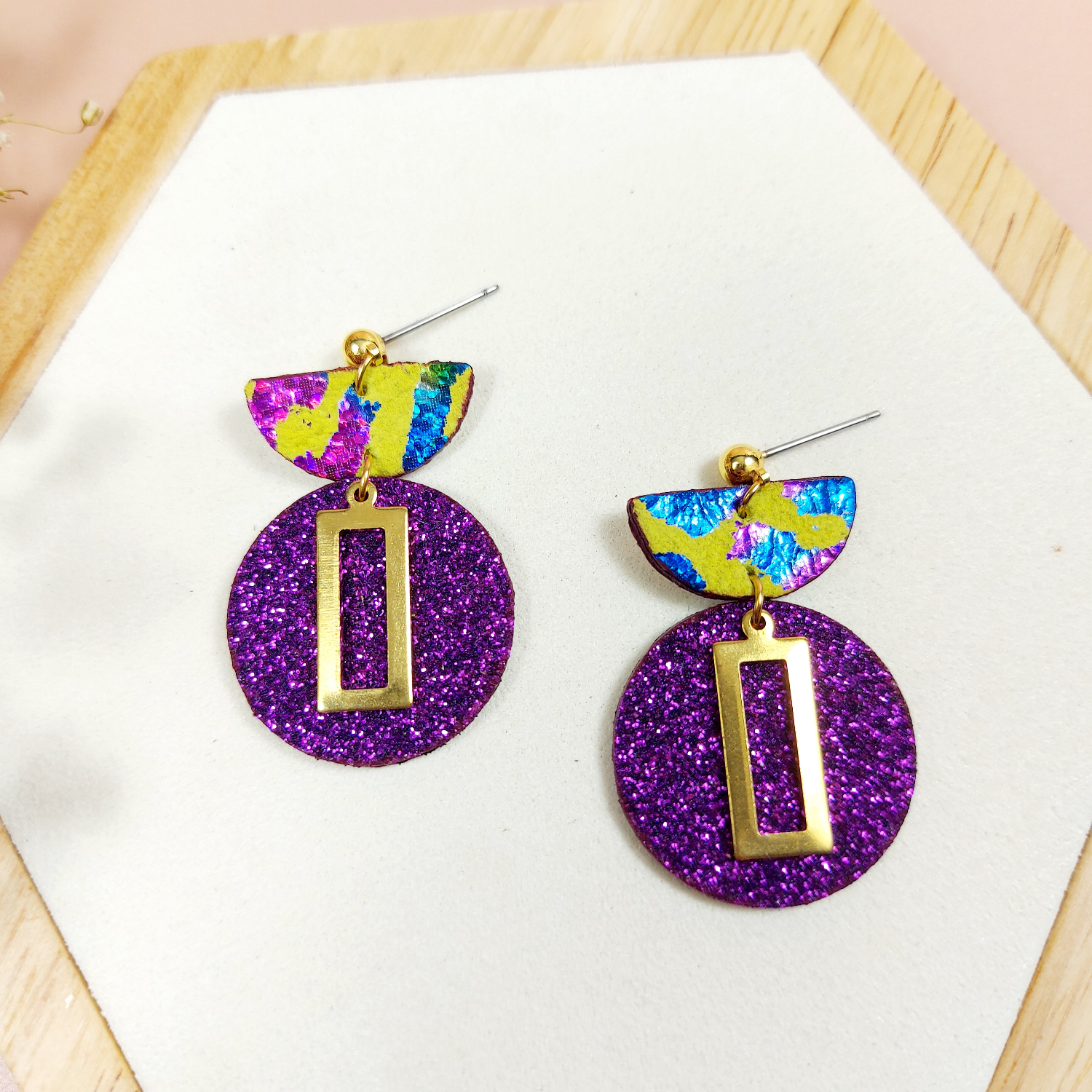 Mettez des paillettes à vos oreilles avec ces boucles d’oreilles en cuir violet. Hypoallergéniques. Fabrication artisanale française. Envoi rapide.