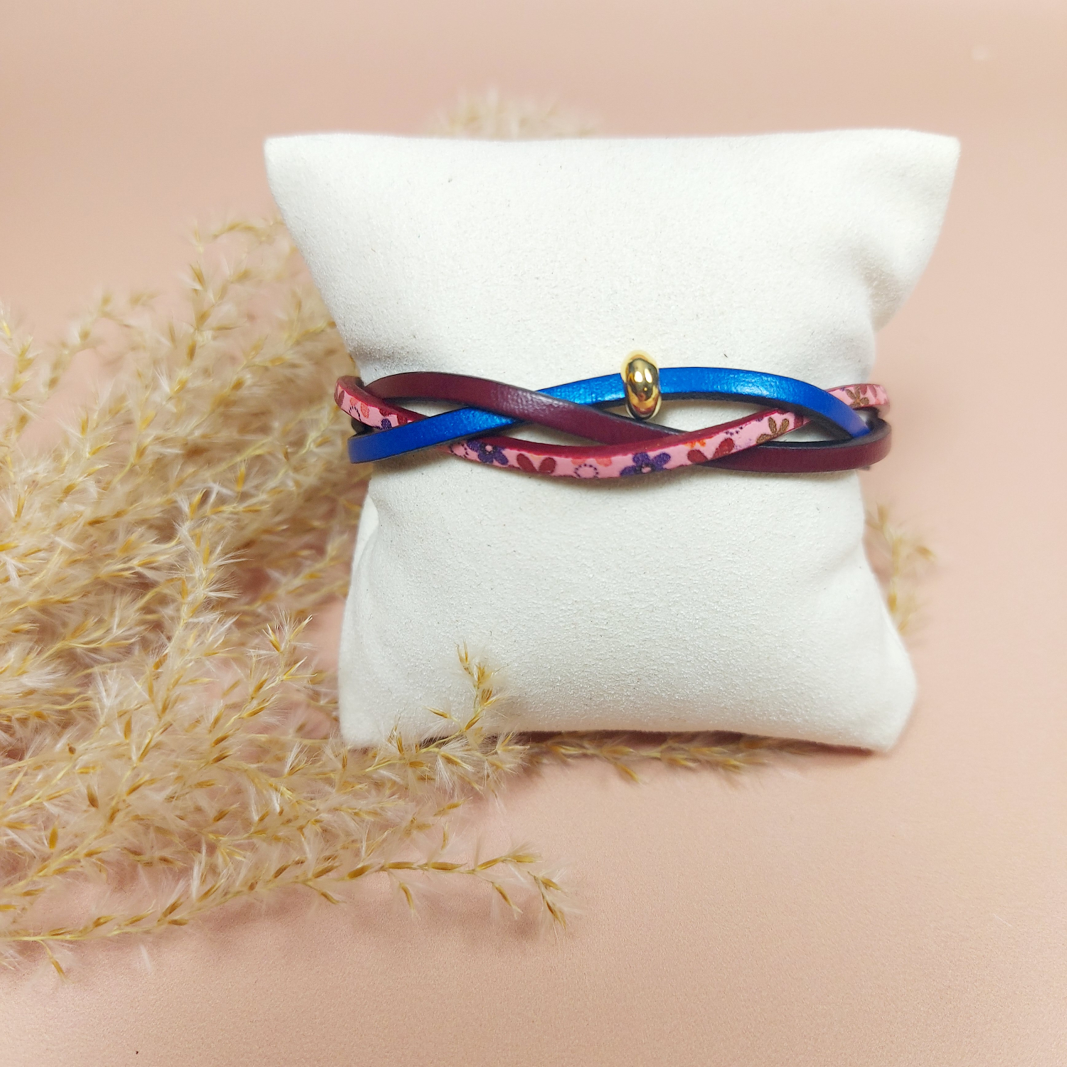 Bracelet 3 brins entrelacés bleu, prune et fleuri