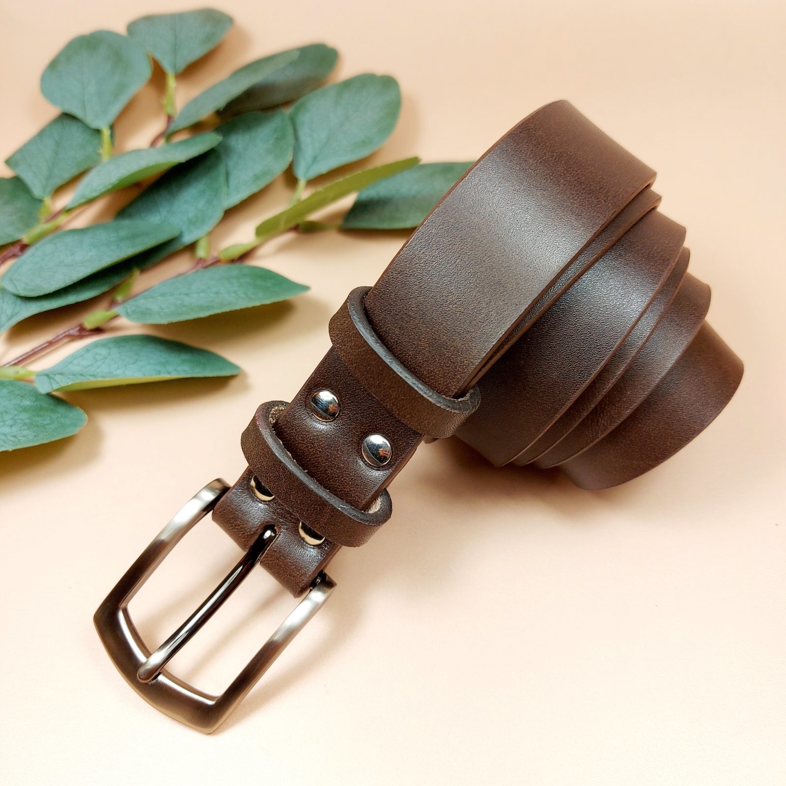 Ceinture artisanale en cuir marron foncé lisse, réalisée sur-mesure. Pour les hommes et les femmes qui souhaitent consommer durable et local.