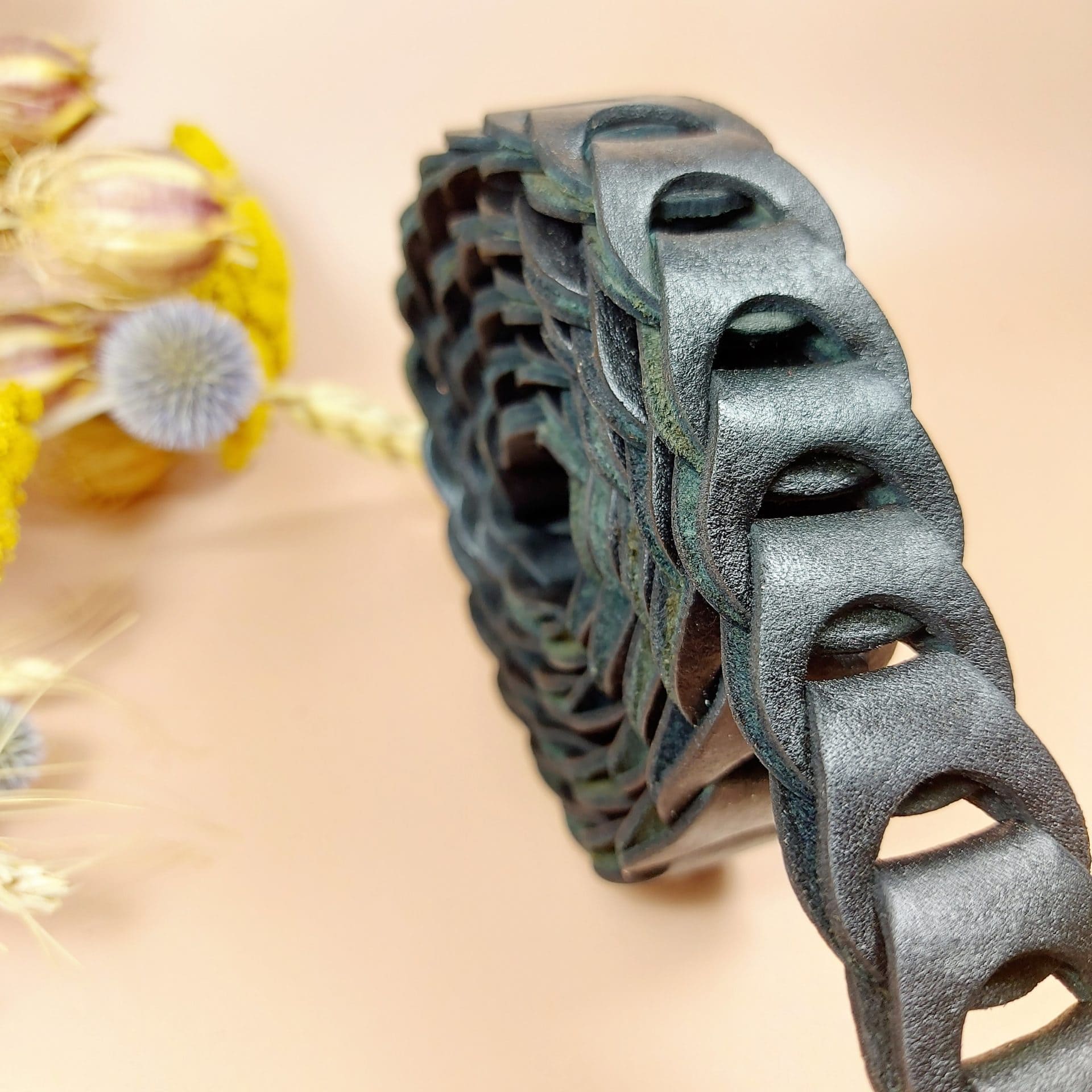 Cuir véritable, pas du simili qui s'effrite en trois mois. Chaque maillon est découpé puis assemblé à la main. Fabrication artisanale, cuir tanné végétal. Pas de chrome, pas de produits toxiques. Pas de série industrielle.
