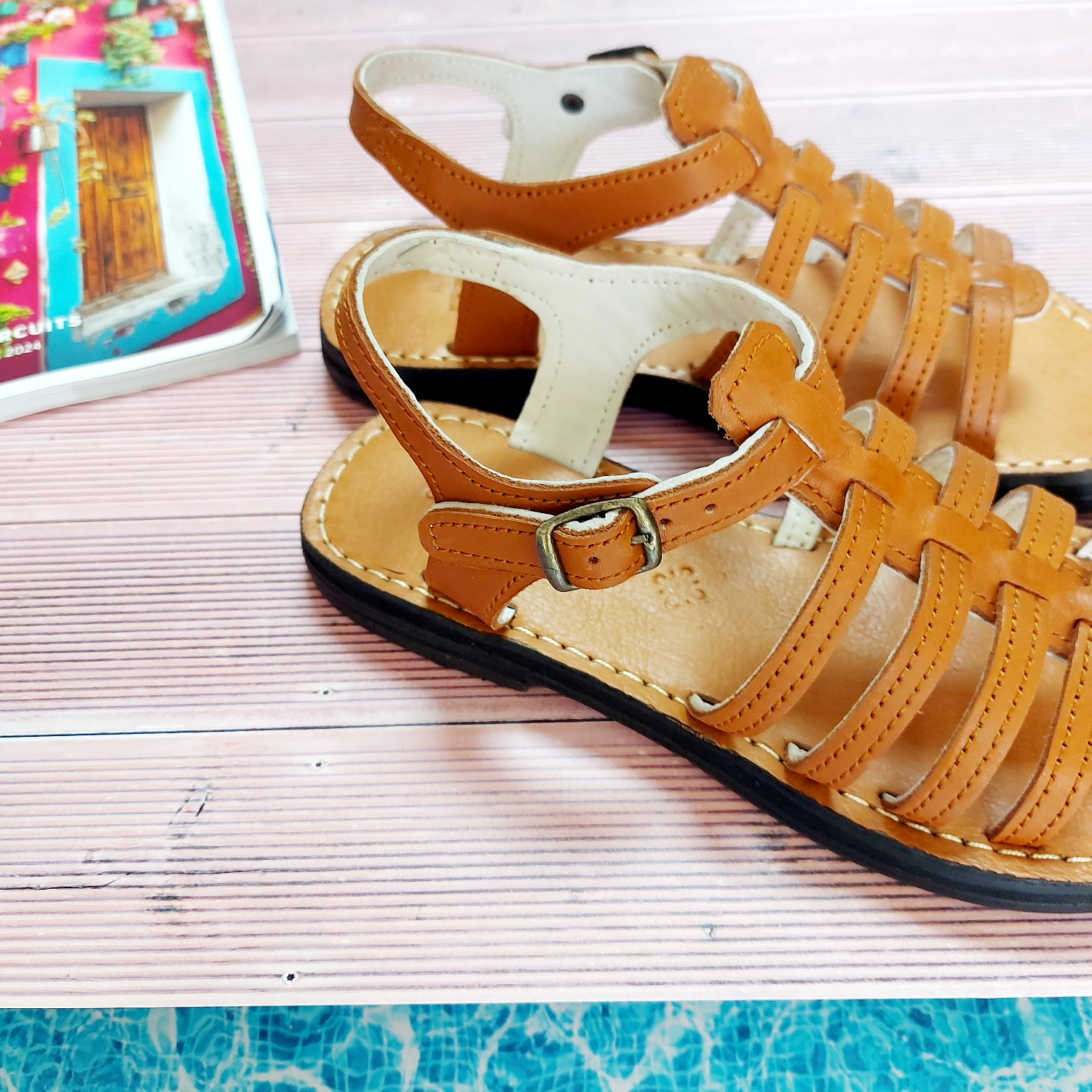 Sandales artisanales en cuir camel, simples et élégantes. Confortables et intemporelles, elles s’adaptent à toutes les tenues estivales.