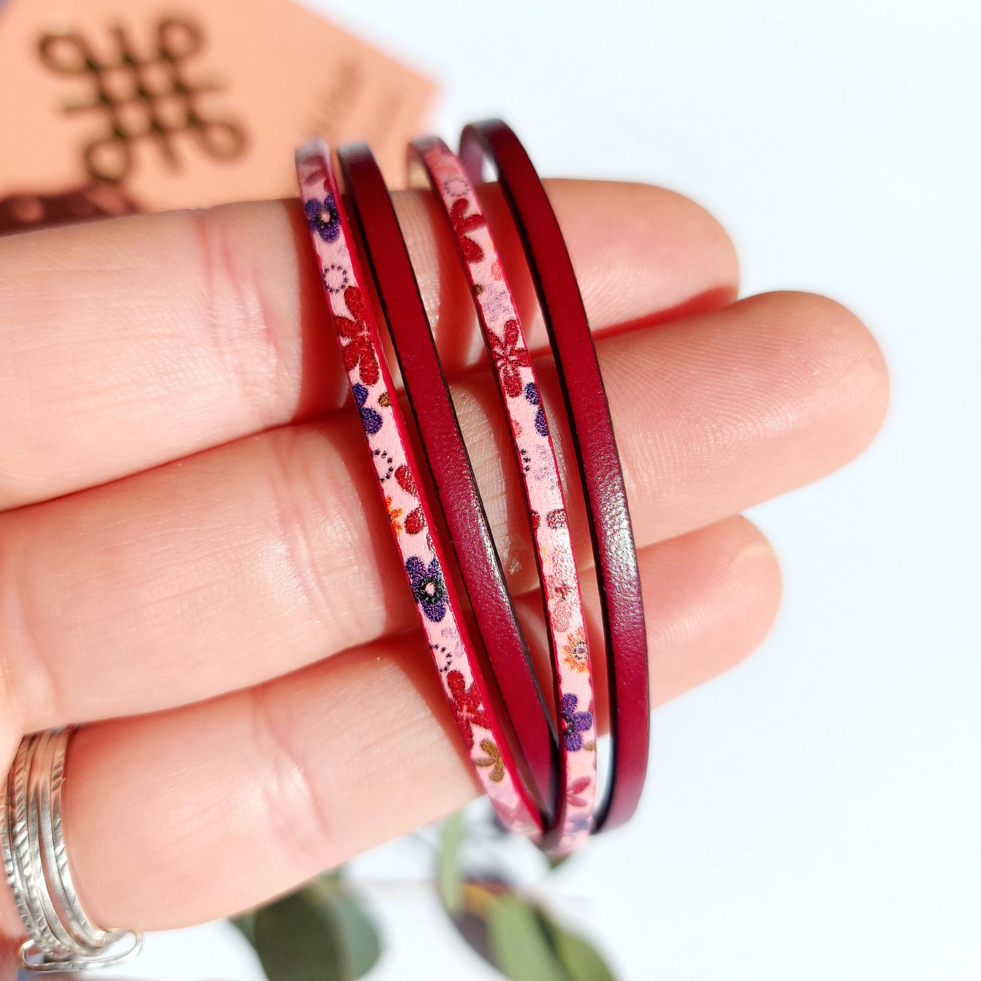 Bracelet fin et féminin en cuir coloris « prune et fleurs » pour un rendu élégant. Fabrication française. Découvrez vite la collection!