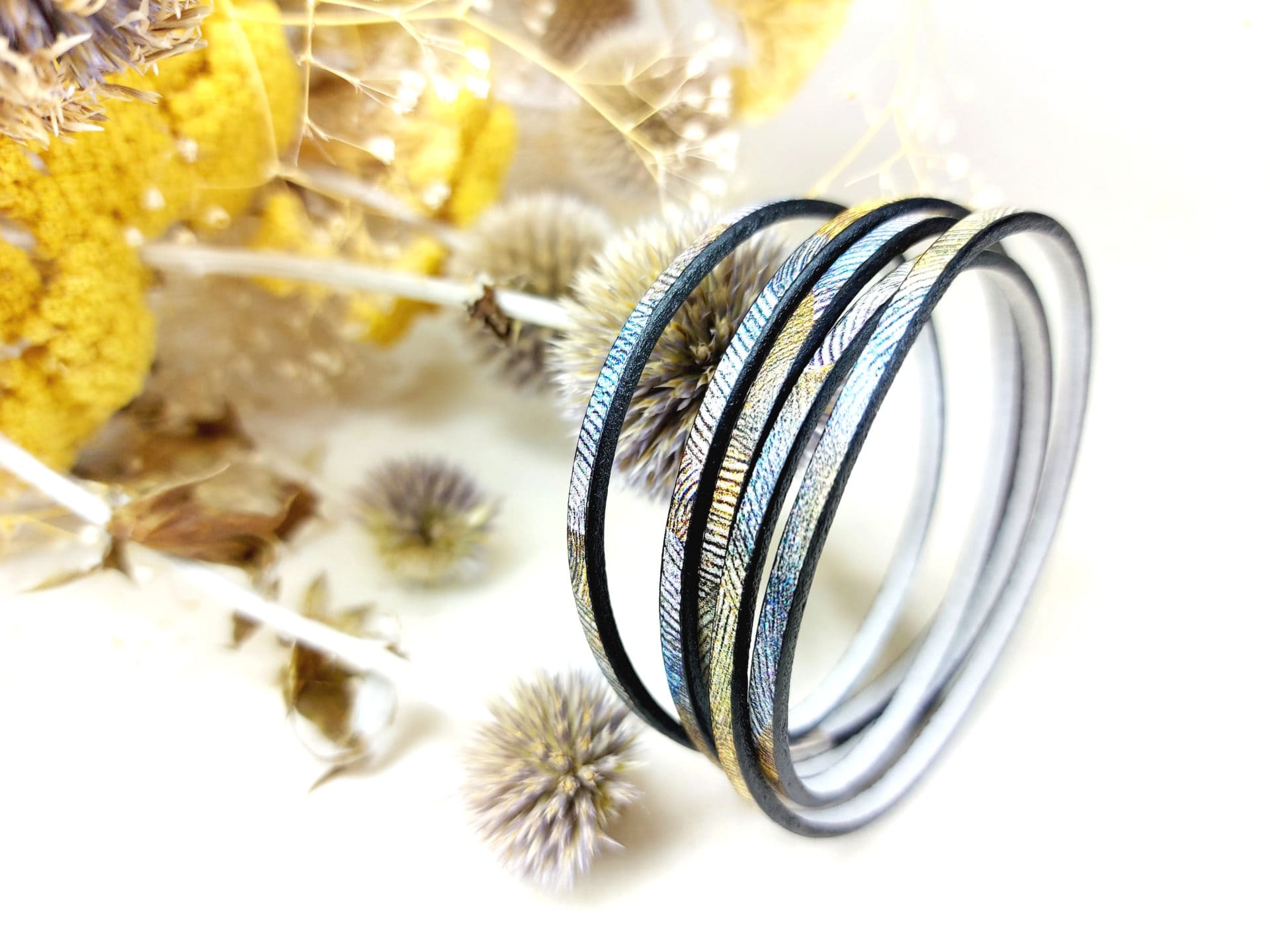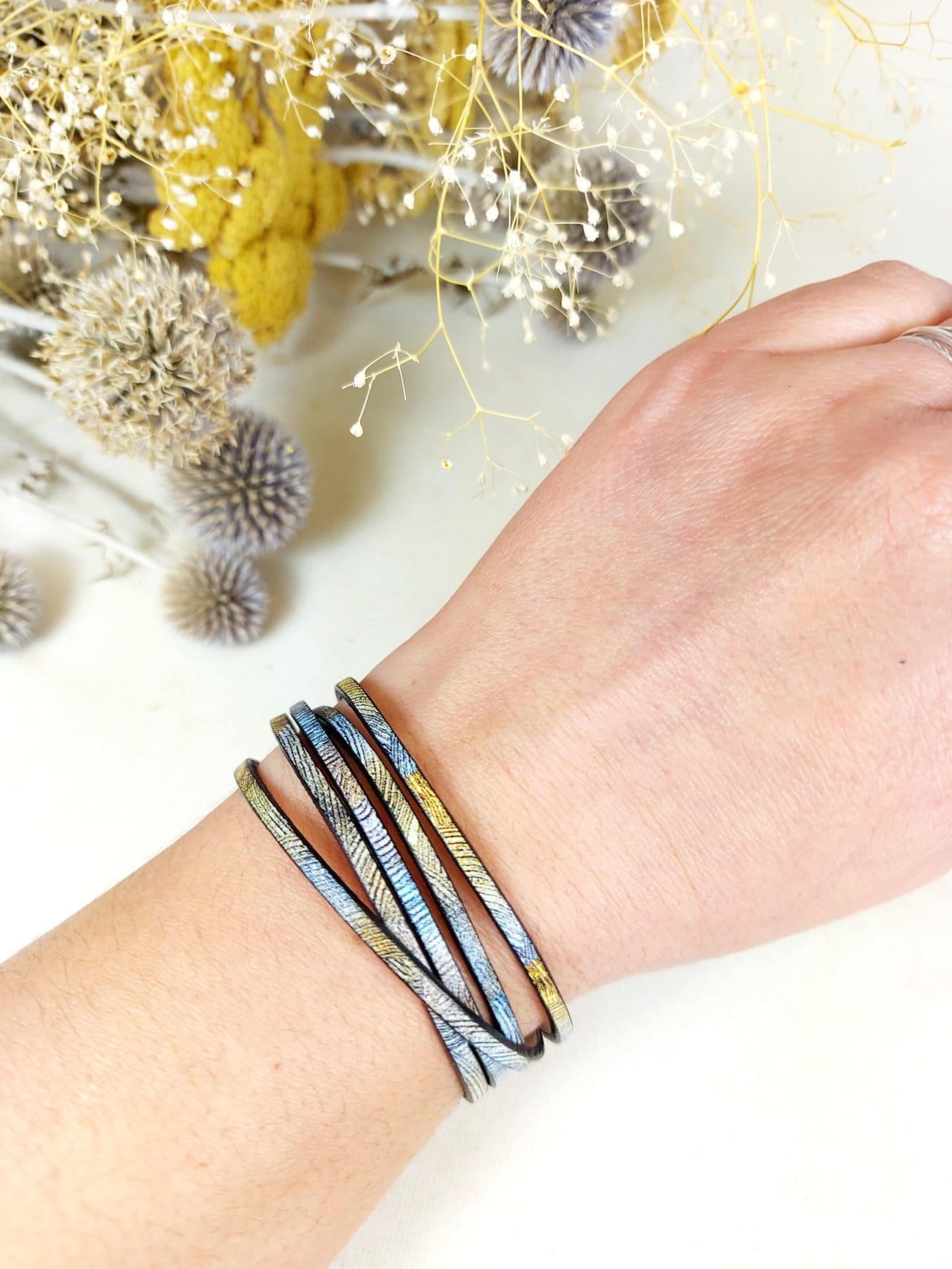Un bracelet en cuir hyper féminin, facile à porter au quotidien, dans des nuances toutes douces de bleu et de gris. Réalisé sur-mesure. Fabrication artisanale française.