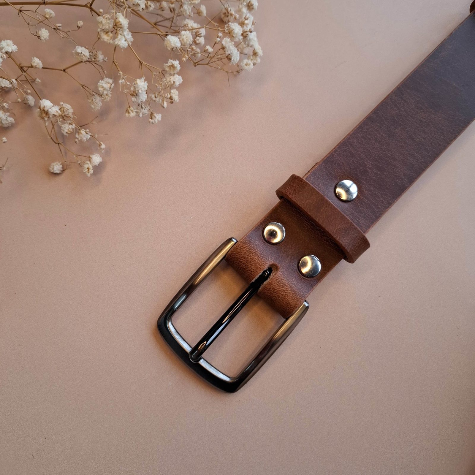 Avec ses 3,5 cm de largeur, elle trouve naturellement sa place sur un jean, un pantalon du quotidien ou une tenue plus soignée. Le marron reste sobre sur les tons sombres et ressort juste ce qu'il faut sur un jean ou un pantalon clair. Ni trop voyante, ni invisible. Juste bien.