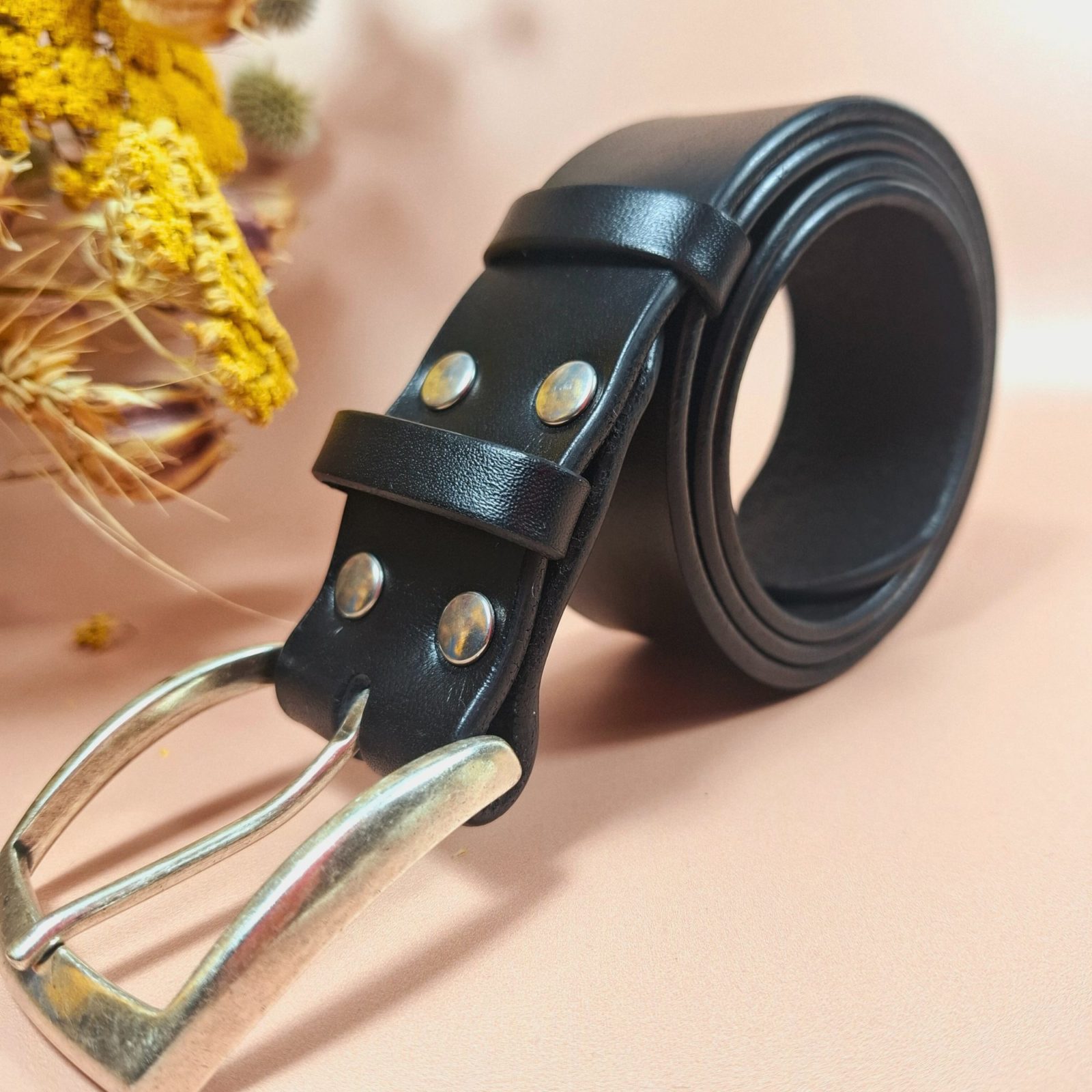 Ceinture large en cuir noir, élégante et robuste. Fabriquée à la main, ajustée sur mesure, conçue pour durer des années.